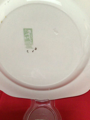 White ceramic commemorative plate featuring a central crest with national flag elements, displayed on a clear plastic stand. Markings on bottom