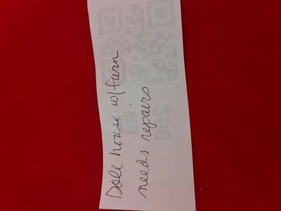 Wooden dollhouse with A collection of miniature dollhouse furniture and accessories, including beds, chairs, tables, shelves, rugs, and small decorative items. Needs some repairs