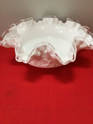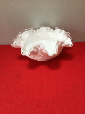 Fenton Spanish lace White milk glass bowl with floral embossing and a clear, ruffled edge.