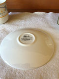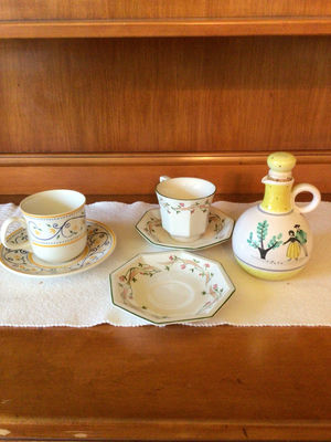 A set of ceramic dinnerware consisting of teacups with saucers, hexagonal and round plates with green and pink floral patterns, and a decorative yellow-handled decanter with a stopper. Marked and. Numbered made in Switzerland