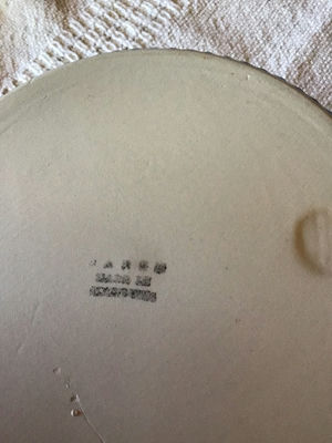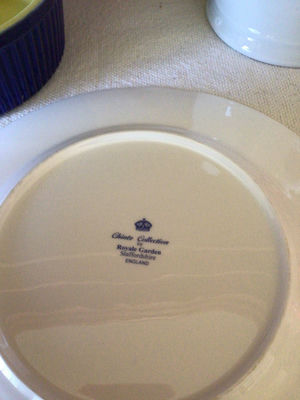 A small ceramic dinnerware set consisting of a floral-patterned plate, a purple ribbed bowl with pale green interior, and a white ceramic pitcher; the bases bear maker marks.