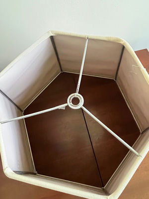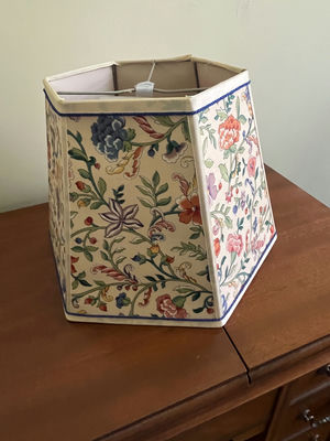 A hexagonal fabric lamp shade featuring a floral pattern on the exterior and a light interior, reinforced with a metal frame and crossbars forming a central ring