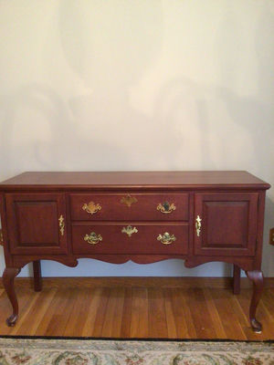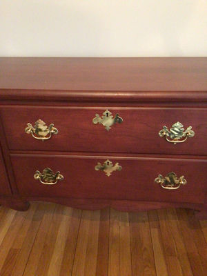 A cherry wood sideboard with two end cabinets and three central drawers, featuring ornate brass hardware and decorative escutcheons. 62x19x36