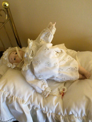 A porcelain baby doll wearing a white eyelet dress and bonnet rests on a white lace-trimmed miniature bed with matching pillows.