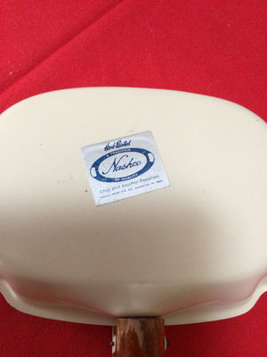 Cream-colored enamel pan with scalloped edges and a wood-handled attachment; decorated with a hand-painted fruit motif featuring a red apple, yellow pear, and purple plum;