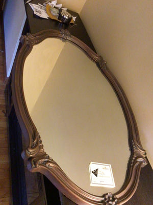Ornate oval mirror with a carved dark wood frame. 34x21