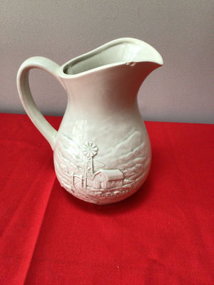 White ceramic pitcher with a raised rooster motif on the side and a farm/landscape relief around the body; base stamped 'OTAGIRI 1982'.