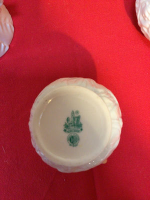 A collection of white porcelain creamer and sugar bowl pieces with textured surfaces, a small porcelain pitcher, a white ribbed bowl, plus a large pink glass serving dish and a pink-flowered pitcher; the bases bear green marks indicating England origin.