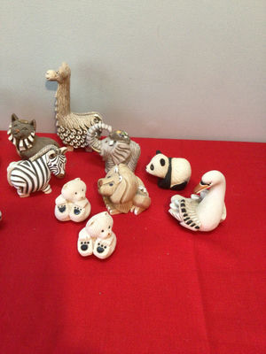 A collection of small carved wooden animals in natural wood tones, including a polar bear, panda, zebra, cat, llama/alpaca, swan, bears cubs, and other stylized figures displayed on a red surface.