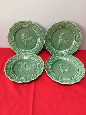 Four green ceramic plates with scalloped edges and an embossed rooster design in the center. Undersides show a Made in Portugal stamp.
