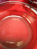 A collection of Pyrex glass kitchenware including two green ribbed bowls, a purple bowl, a red scalloped-edge bowl, and a red casserole dish with handles. All pieces are glass and marked Pyrex.