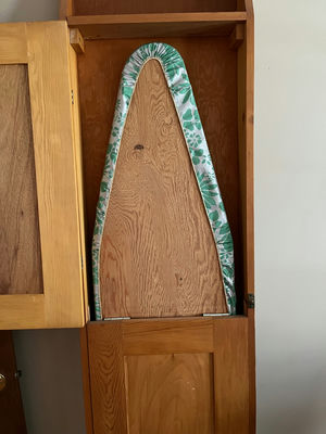 A tall two-door wooden cabinet containing a folding ironing board stored inside