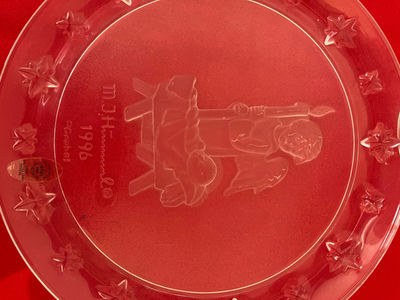 A set of three decorative ceramic plates: two blue-toned plates depicting winter scenes and a larger clear etched plate with a central figure and star border.