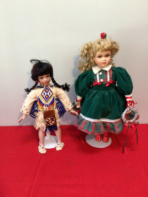 Two dolls wearing traditional-style outfits: one with beadwork, fringes, and braided dark hair; the other in a green dress with plaid trim and a curly blonde wig, holding a decorative wreath.
