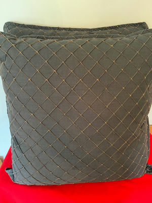 Two grey quilted throw pillows with orange thread accent 25x 25
