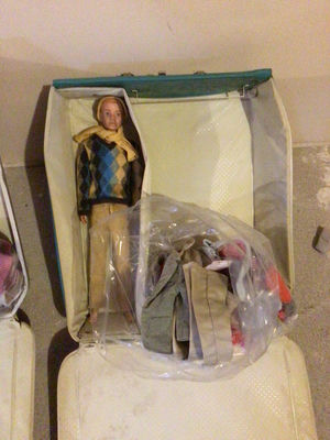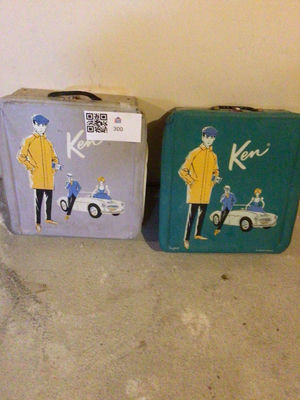 Two vintage Ken-brand suitcases with illustrated figures on their surfaces. One suitcase is opened to reveal a mannequin figure and folded clothing inside; the other contains clothing items organized in plastic bags.