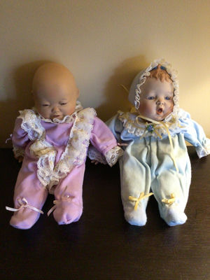 Two soft-bodied dolls with plastic heads are dressed in pastel outfits; one pink with lace trim and ribbon bows, the other blue with lace trim and ribbons, markings on back neck