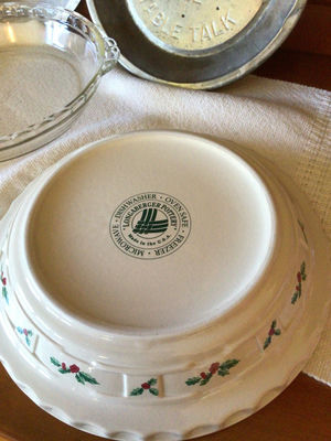A collection of bakeware and dishware including multiple round aluminum pie pans with embossed markings such as 'New England Flaky Crust Pie' and 'Table Talk Inc. Deposit', a clear glass with red-handled lid, a glass baking dish, a white ceramic casserole with a green rim, and a Longaberger Pottery dish (made in the USA) with holly decoration.