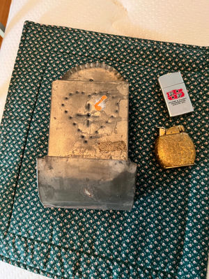 A tarnished metal match holder along with two vintage lighters: one gray rectangular lighter with a red emblem and one gold floral-patterned pocket lighter.