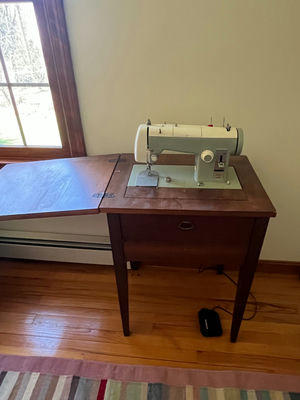 A vintage sewing machine mounted on a wooden table with a built-in drawer, a foot pedal on the floor, and top spool pins.