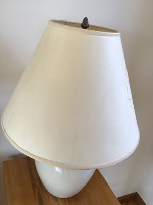 A white ceramic table lamp with a tapered fabric lampshade that has a decorative cut-out floral pattern. It includes a dark metal finial on top and a visible power cord. Approx 22”