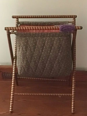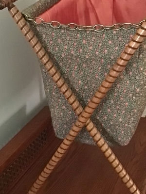 A wicker folding laundry rack with crossed legs supporting a floral fabric bag that has a pink interior lining; a metal chain runs along the top edge.