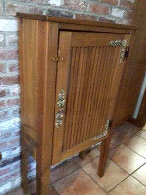 A small wooden cabinet on four legs featuring a slatted vent-style front panel and decorative floral metal hardware on the doors. 20x40 approx