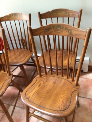 A group of wooden dining chairs with tall spindle-back design, rounded seats, and carved decorative motifs on the back rails.