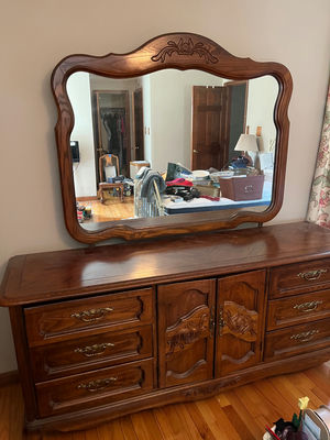 A wooden dresser with an attached ornate mirror. The piece features multiple drawers with brass handles and carved details on the drawer fronts and lower trim. The mirror has a decorative crest and a curved frame. Bureau measures 72long, 32 high, 19 wide. Mirror measures 50x40