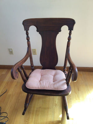 A dark wooden rocking chair with curved arms and turned spindles, featuring a tufted red-and-white striped cushion on the seat.