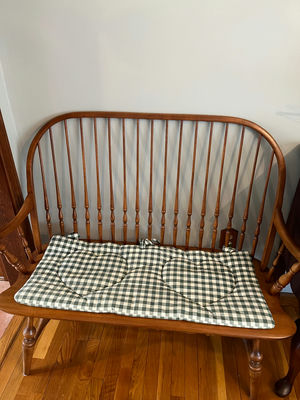 A wooden Windsor-style bench with a curved back and spindle supports, topped by a green-and-white plaid seat cushion featuring two circular sections. Approx 40”